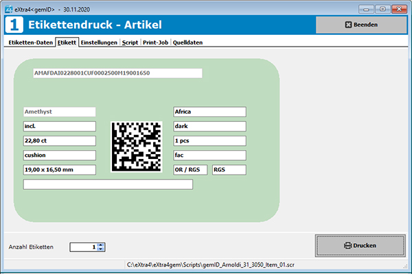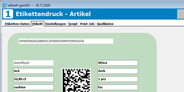 Mit eXtra4-gemID hast du dein Edelstein-Sortiment sicher im Griff. Die Windows-kompatible Anwendung hilft dir, jeden einzelnen deiner Steine mit seinen Qualitäten in einer Datenbank zu hinterlegen. Das charakteristische Daten-Profil eines Steins wandelt die Software in Code und gibt ihn zum Auszeichnen deines Warenlagers auf Etiketten aus.