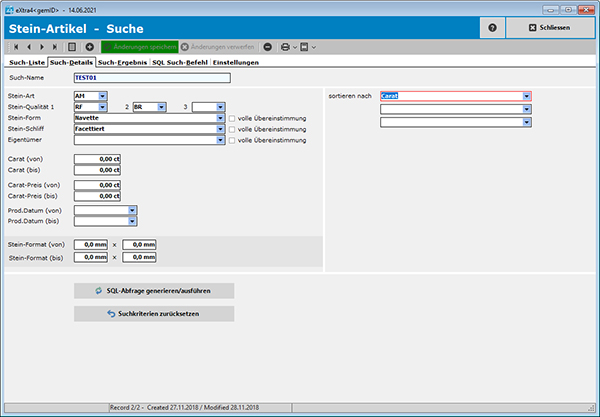Schneide das Programm auf dein Sortiment zu! Bei der Klassifikation hinterlegst du jeden einzelnen Stein-Artikel mit seinen charakteristischen Merkmalen. Du bestimmst, welche Qualitätskriterien für dich entscheidend sind. Am Ende steht dir dein Warenbestand in einer Datenbank mit allen wichtigen Angaben in einem einzigen Datensatz pro Artikel zur Verfügung.