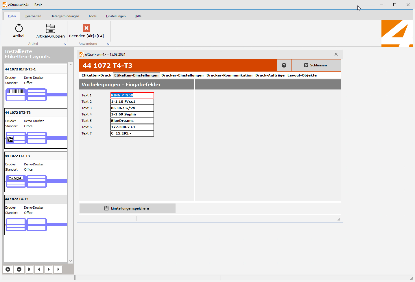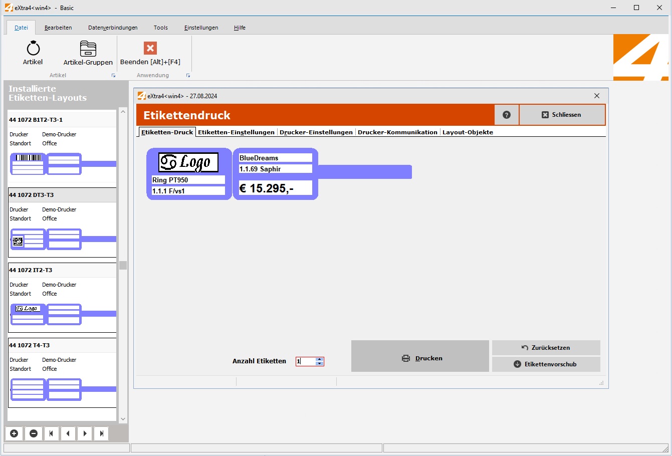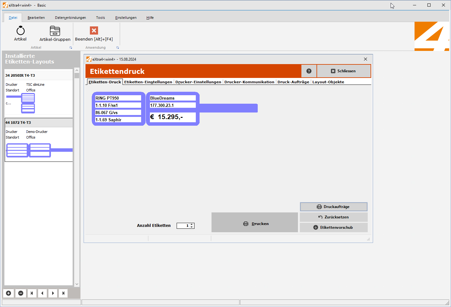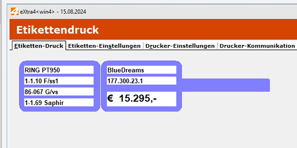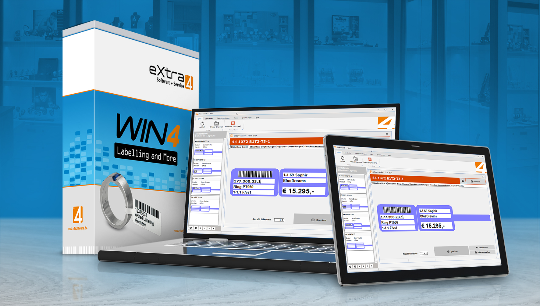 Von deinem Rechner oder Tablet mit Windows-Betriebssystem ab Version 10 druckst du via eXtra4-win4 Juwelier-Etiketten im Handumdrehen. Darüber hinaus kannst du Schmuck und Uhren in Gruppen strukturieren. Das modulare Programm stellt dir zusätzliche Features in drei Editionen zur Verfügung. Die Sprache des Programms kannst du selbst aus verschiedenen wählen. Als Nutzer von eXtra4-win4 baust du auf die Praxiserfahrung einer in Jahrzehnten gewachsenen Branchen-Community rund um den Globus.